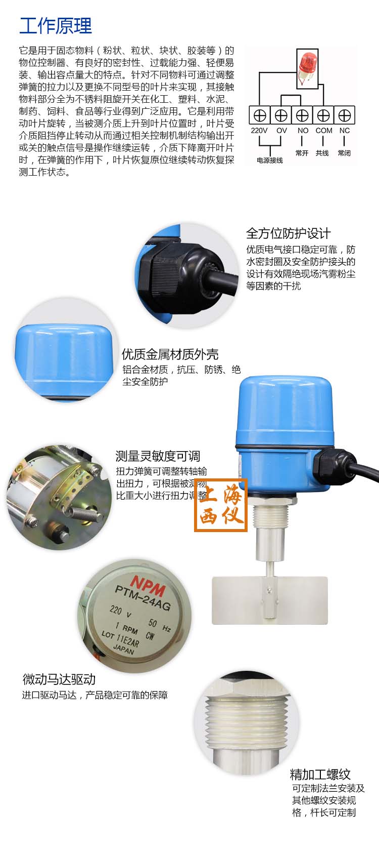 阻旋料位開關(guān)采用交流微電機(jī)經(jīng)減速后,帶動監(jiān)測葉片慢速旋轉(zhuǎn),當(dāng)物料的料位上升使葉片的轉(zhuǎn)動受到阻擋時,檢測機(jī)構(gòu)便圍繞主軸產(chǎn)生旋轉(zhuǎn)位移。